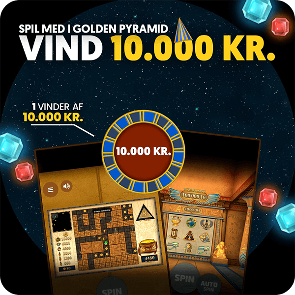 - Spiller du for 2 kr. i Golden Pyramid i perioden fra 20/3 kl. 08.00 til 22/3 kl. 23.59, deltager du automatisk i konkurrencen om at vinde: 10.000 kr.